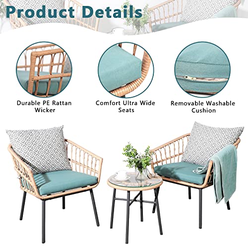 wOod-it 3 Piece Patio Furniture Outdoor Conversation Bistro Set with Tempered Coffee Table and Wicker Chairs for Garden Balcony Backyard Yard Poolside (Green)