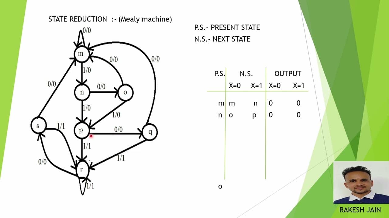 In this lecture, Rakesh Jain, Assistant Professor (ECE) at Gitanjali Institute of Technical Studies, Udaipur, explains the concept of State Reduction in Sequential Circuits using a Mealy Machine example. State reduction is an important technique in Finite State Machine (FSM) design that helps minimise the number of states without changing the external behaviour of the system. By identifying equivalent states, we can reduce hardware complexity, decrease flip-flop count, lower power consumption, and improve overall reliability.